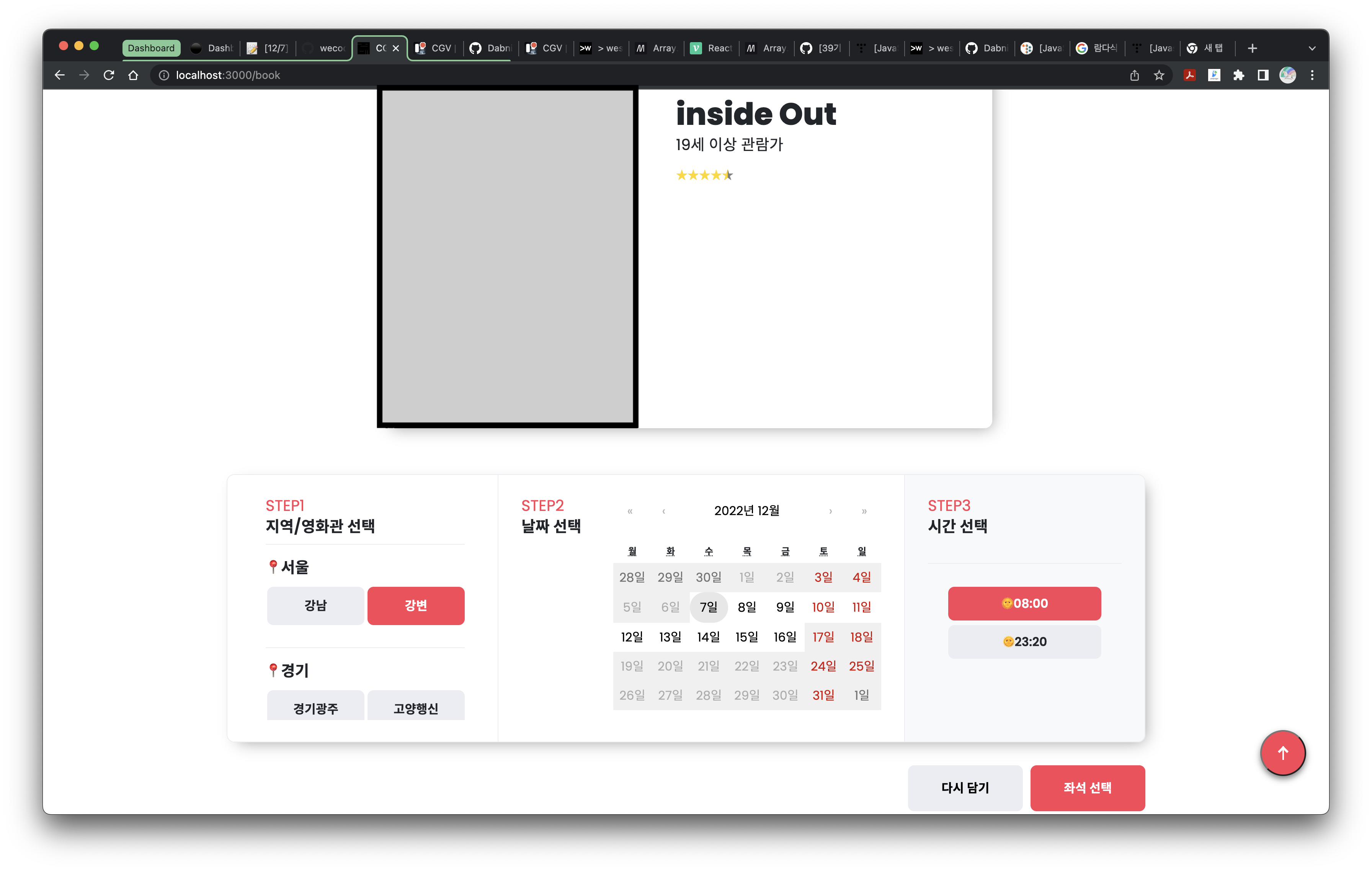 위와 같이 cgv의 예매사이트는 너무 복잡해보였지 때문에 조금은 다른 예매 페이지를 구상하였고 먼저 영화를 선택했을 때 그에 해당하는 정보들을 선택할 수 있게끔 하려 했다.