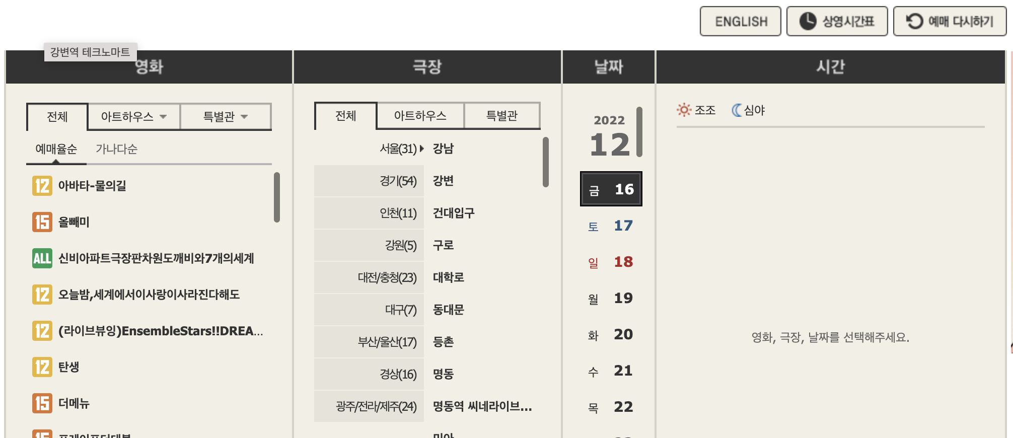 하지만 영화와 영화관을 선택했을 때 해당영화관에 선택된 영화가 매일매일 상영되는 것은 아니었다.